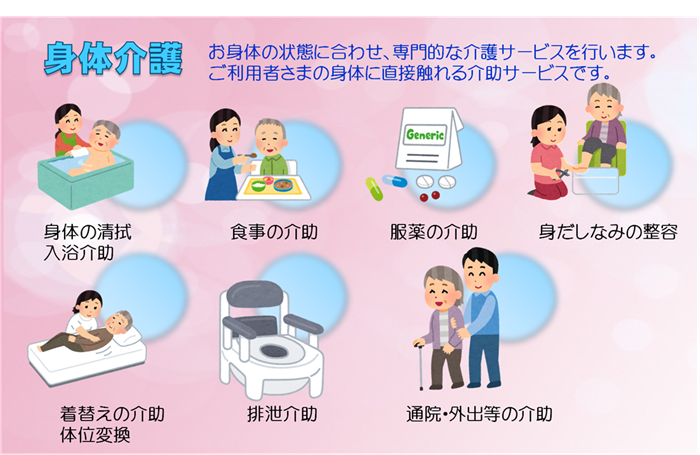洗髪、排泄、衣類の着脱、床ずれの予防、体位変換・姿勢交換、ベッドメイキング